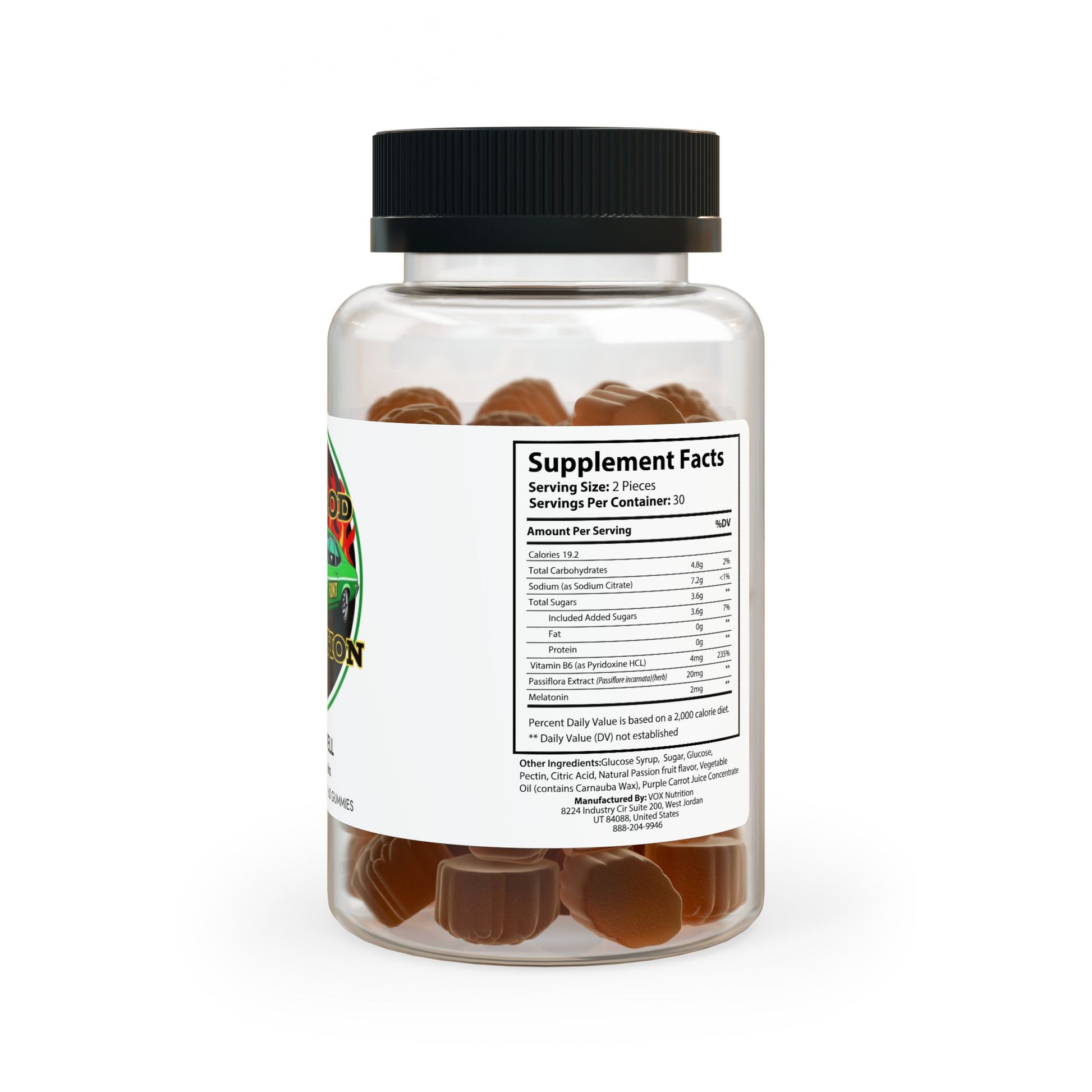Ingredients: Sodium (as Sodium Citrate), Vitamin B6 (as Pyridoxine HCL), Passiora Extract (Passiore incarnata)(herb), Melatonin. Other Ingredients: Glucose Syrup, Sugar, Glucose, Pectin, Citric Acid, Natural Passion fruit avor, Vegetable Oil (contains Carnauba Wax), Purple Carrot Juice Concentrate